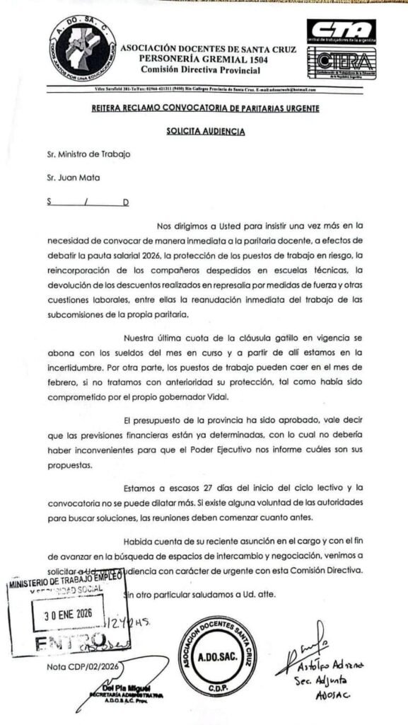 La Asociación de Docentes de Santa Cruz (ADOSAC) ha formalizado hoy su tercera solicitud consecutiva ante el Ministerio de Trabajo, Empleo y Seguridad Social, exigiendo la apertura inmediata de la mesa paritaria.