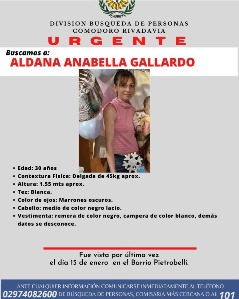 La División Búsqueda de Personas de la ciudad de Comodoro Rivadavia, solicita la colaboración de la comunidad en general para dar con el paradero de la Aldana Anabella Gallardo de 30 años de edad.