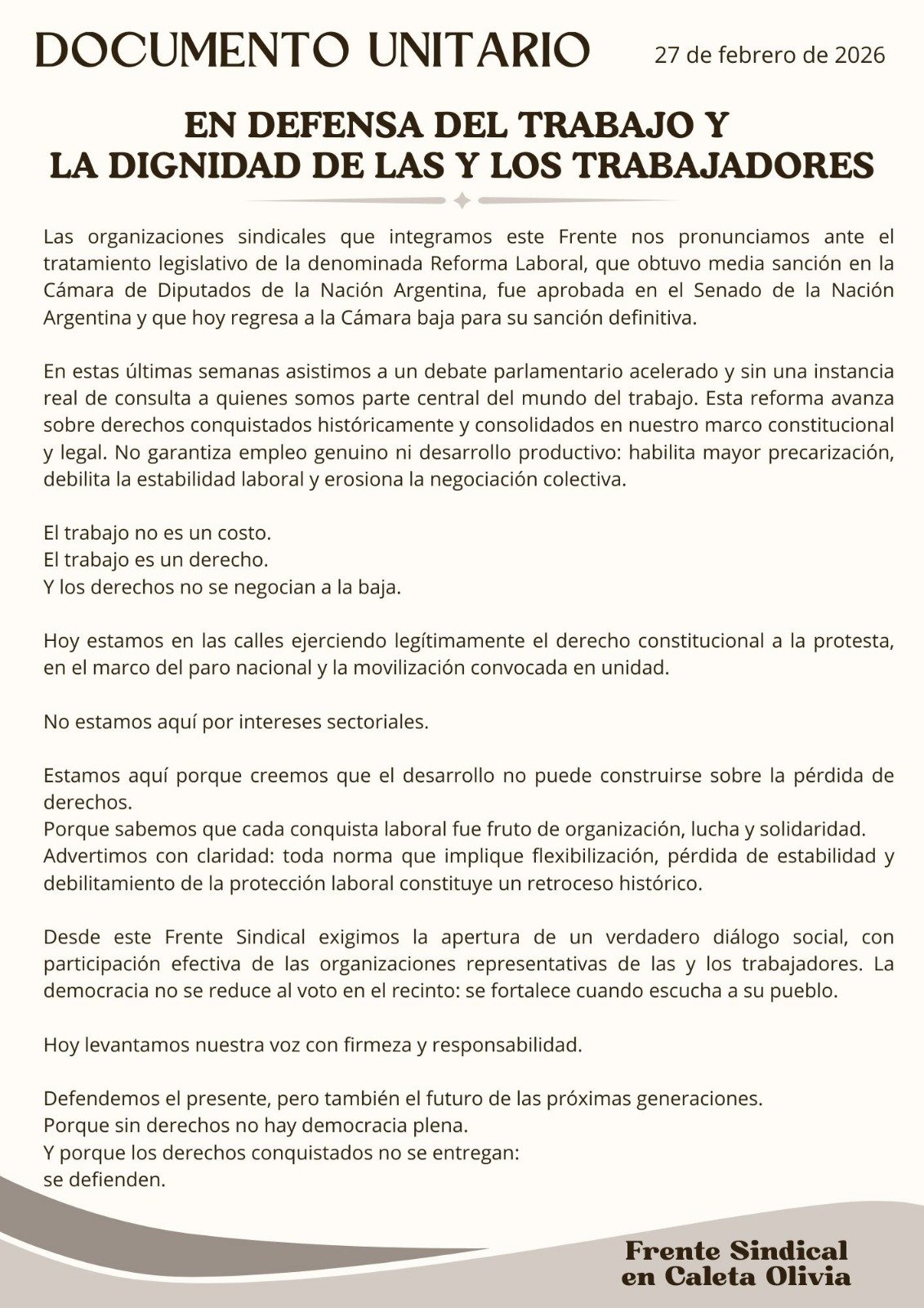 El Frente Sindical en Caleta Olivia se pronunció en rechazo de Reforma Laboral. A través de un documento unitario fechado el 27 de febrero, las organizaciones sindicales que integran el espacio expresaron su rechazo a la iniciativa y cuestionaron el “debate parlamentario acelerado y sin una instancia real de consulta” a los representantes del mundo del trabajo.