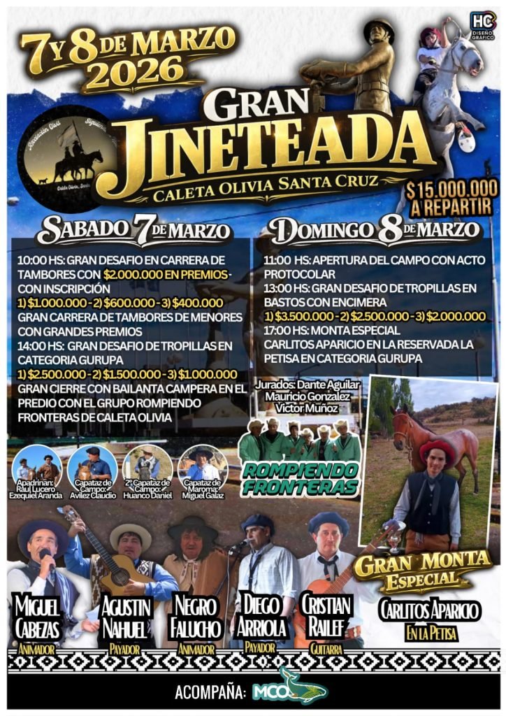 La organización invita a toda la comunidad de Caleta Olivia y localidades vecinas a participar de este encuentro que promete reunir tradición, destreza criolla y un importante espectáculo para disfrutar en familia.