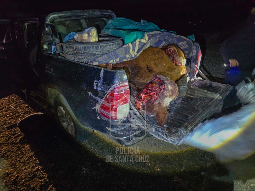 En la caja de carga transportaban una moto con manchas de aparente origen sanguinolento, mientras que en el interior del rodado se observaban tres armas largas y el conductor portaba un cuchillo de gran tamaño. Ante estos hallazgos, se efectuó la conducción controlada de ambos vehículos y sus ocupantes hacia la localidad de Pico Truncado para las diligencias correspondientes.