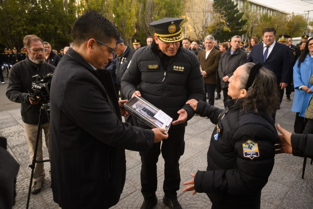 Otro momento significativo tuvo lugar cuando el titular del Ejecutivo Provincial, le entregó un presente especial a la vecina Lioba Bustamante. Desde hace más de 40 años, la vecina acompaña los actos que se hacen en Jefatura de Policía y cumple años, precisamente, el 2 de abril.
