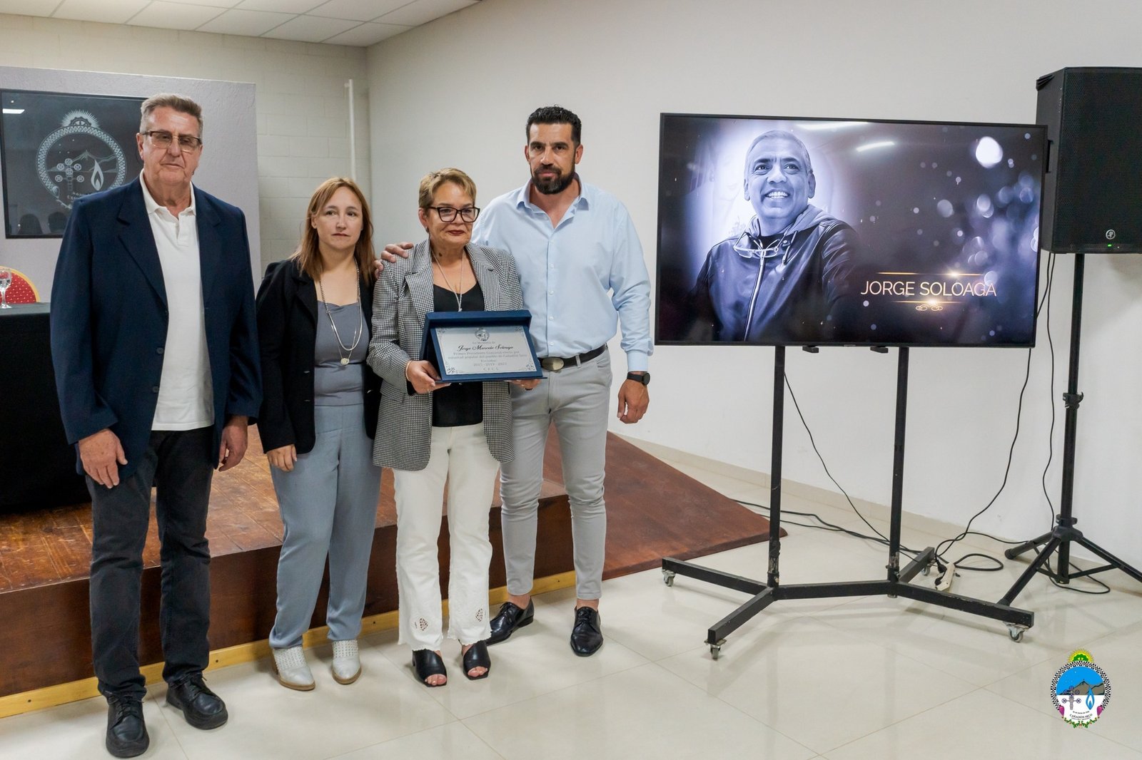 Uno de los momentos más emotivos fue la entrega de una placa a Susana Álvarez, esposa de Jorge Marcelo Soloaga, en memoria de su legado como conductor político y propulsor de la modernización de Cañadón Seco.