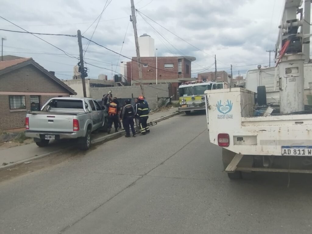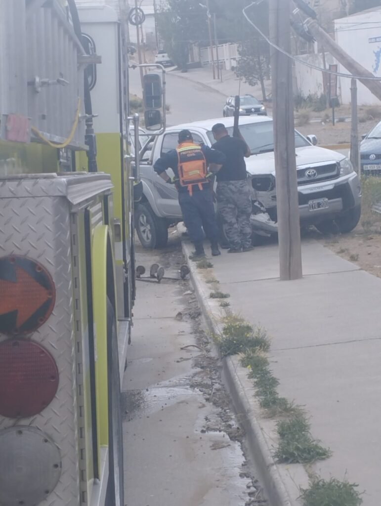 Un grave accidente de tránsito se registró esta tarde en la intersección de la Ruta Provincial Nº 12 y calle Marta Crowe en Caleta Olivia, cuando una camioneta Toyota Hilux perdió el control y terminó impactando contra el cordón y la vereda, provocando importantes daños materiales y afectaciones en el servicio eléctrico de la zona.