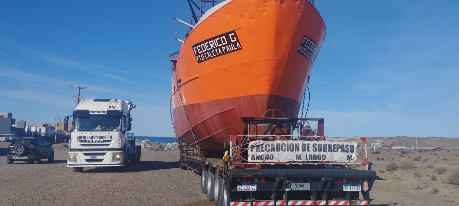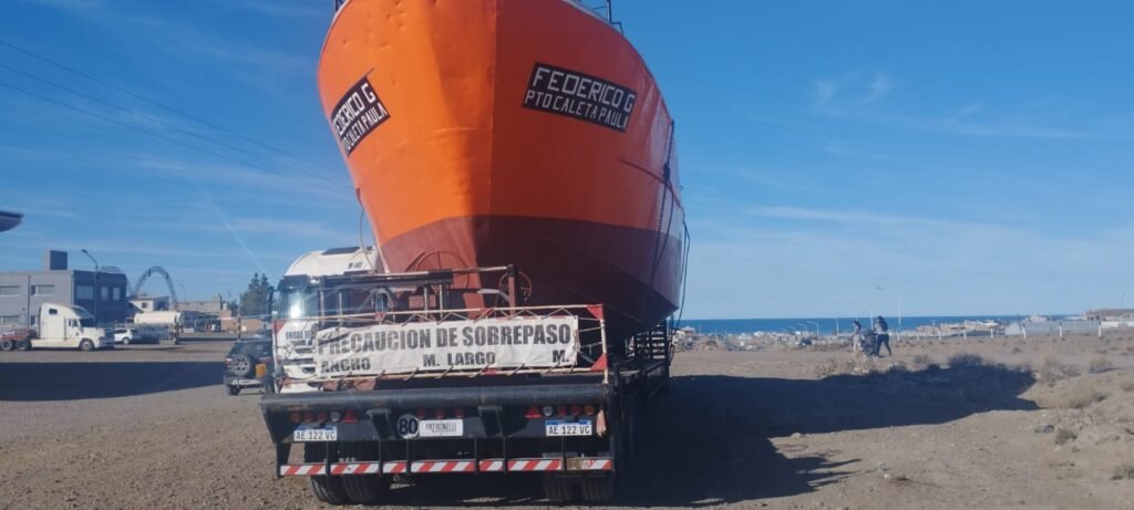 Se trata del pesquero identificado como “Federico C”, que fue trasladado por ruta mediante un dispositivo especial debido a sus dimensiones, lo que implicó la utilización de un semirremolque de gran porte y el acompañamiento de personal especializado.