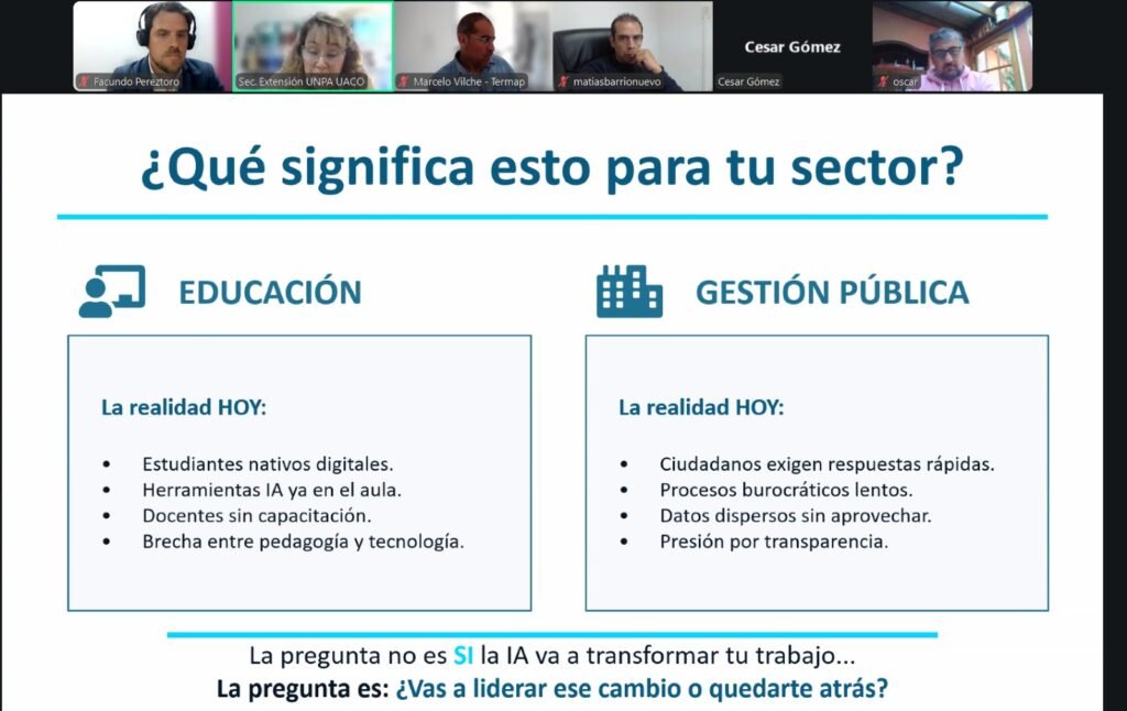 Durante el encuentro, Villagra explicó que la diplomatura está pensada como un trayecto formativo teórico-práctico dirigido a docentes, equipos de gestión, trabajadores del ámbito público y profesionales que deseen incorporar herramientas de IA generativa a sus prácticas cotidianas.