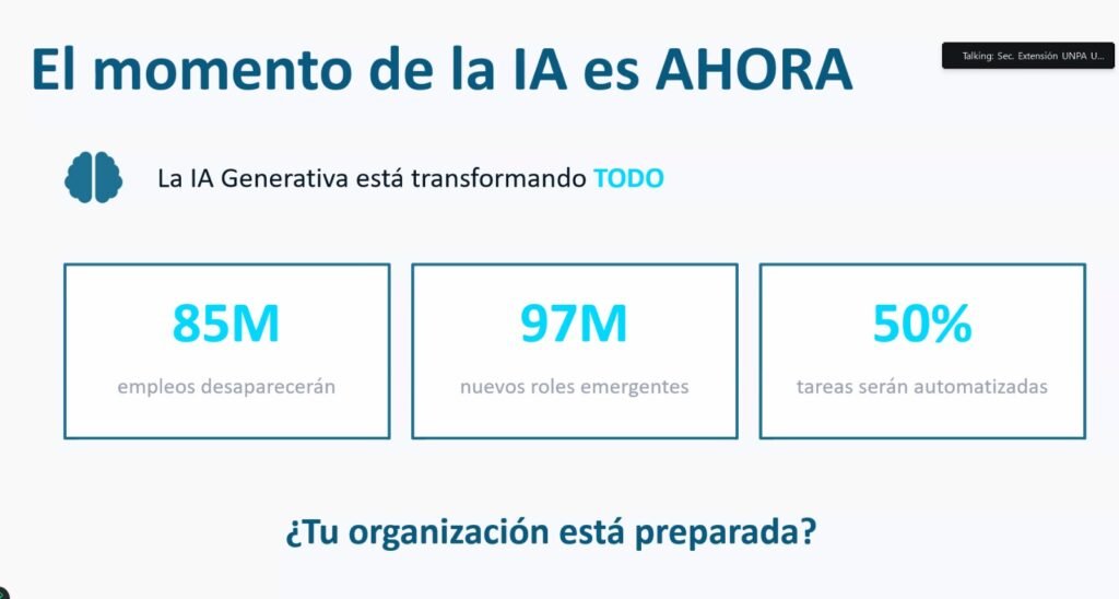 En su exposición, la Dra. Villagra dio a conocer el plantel docente que llevará a cabo esta propuesta e hizo especial hincapié en el contexto histórico actual, señalando que “el momento de la Inteligencia Artificial es ahora, y esto no es una frase hecha, sino que es el contexto en el que vivimos, en medio de la quinta revolución industrial”. En ese sentido, invitó a las y los presentes a reflexionar sobre un interrogante central: si cada uno, y sus organizaciones, están realmente preparados para dar este paso.